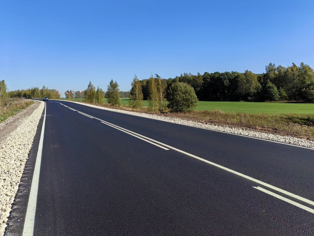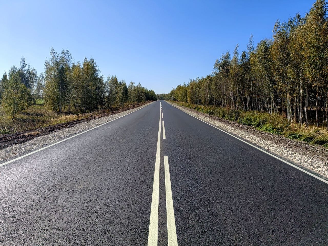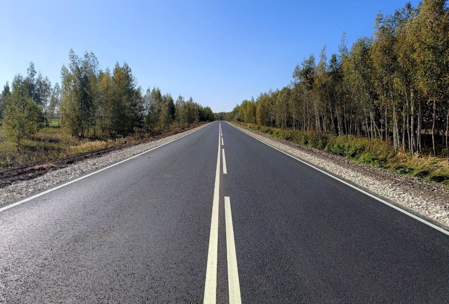 Подрядная организация приступила к работам в июне. Специалисты полностью обновили асфальтобетонное покрытие на двух участках, укрепили обочины щебнем, восстановили съезды и остановочные площадки, нанесли разметку.